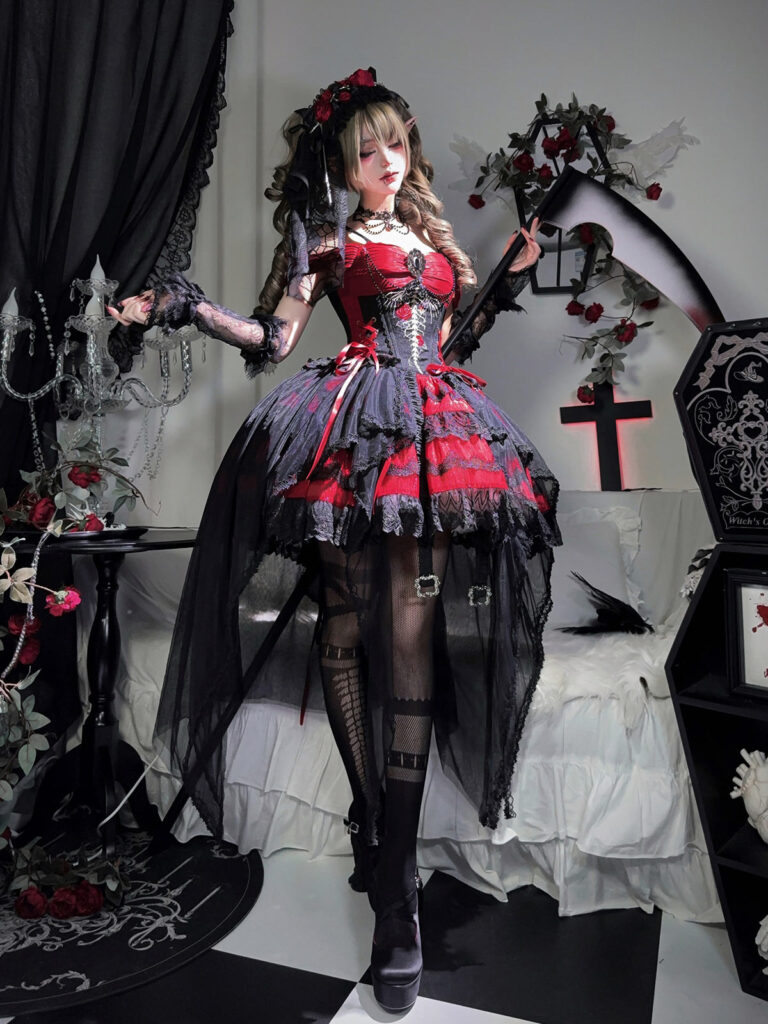 【Eternal Dragon Bones & Rose Thorns】 Uncharted Stars Original Dark Gothic Lolita JSK Dress Spring/Summer – Embroidery, Overlay Mesh, Red-Black Color Blocking