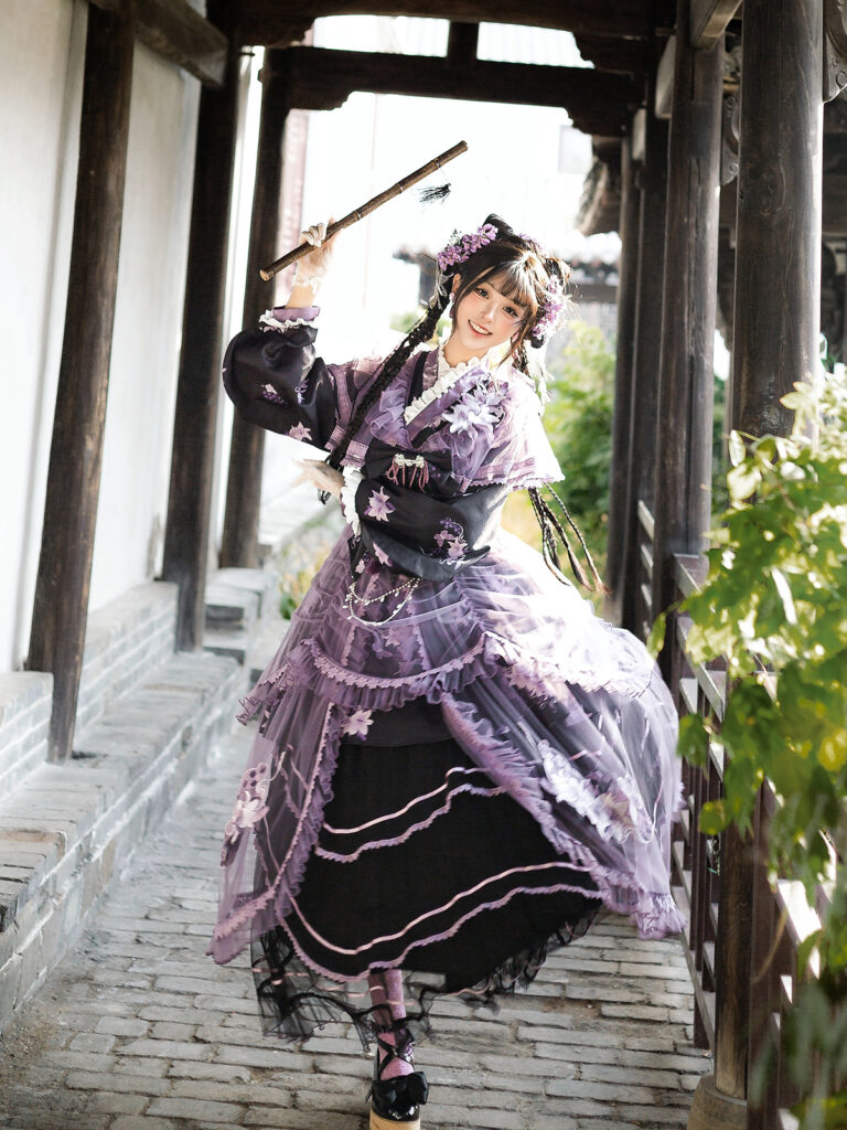 $99.00【Purple Silk Lily】 Uncharted Stars Original Purple Silk Lily Chinese Style Lolita Overdress Elegant CLA Dress Set – Frog Buttons, Tassels, Beaded Chain