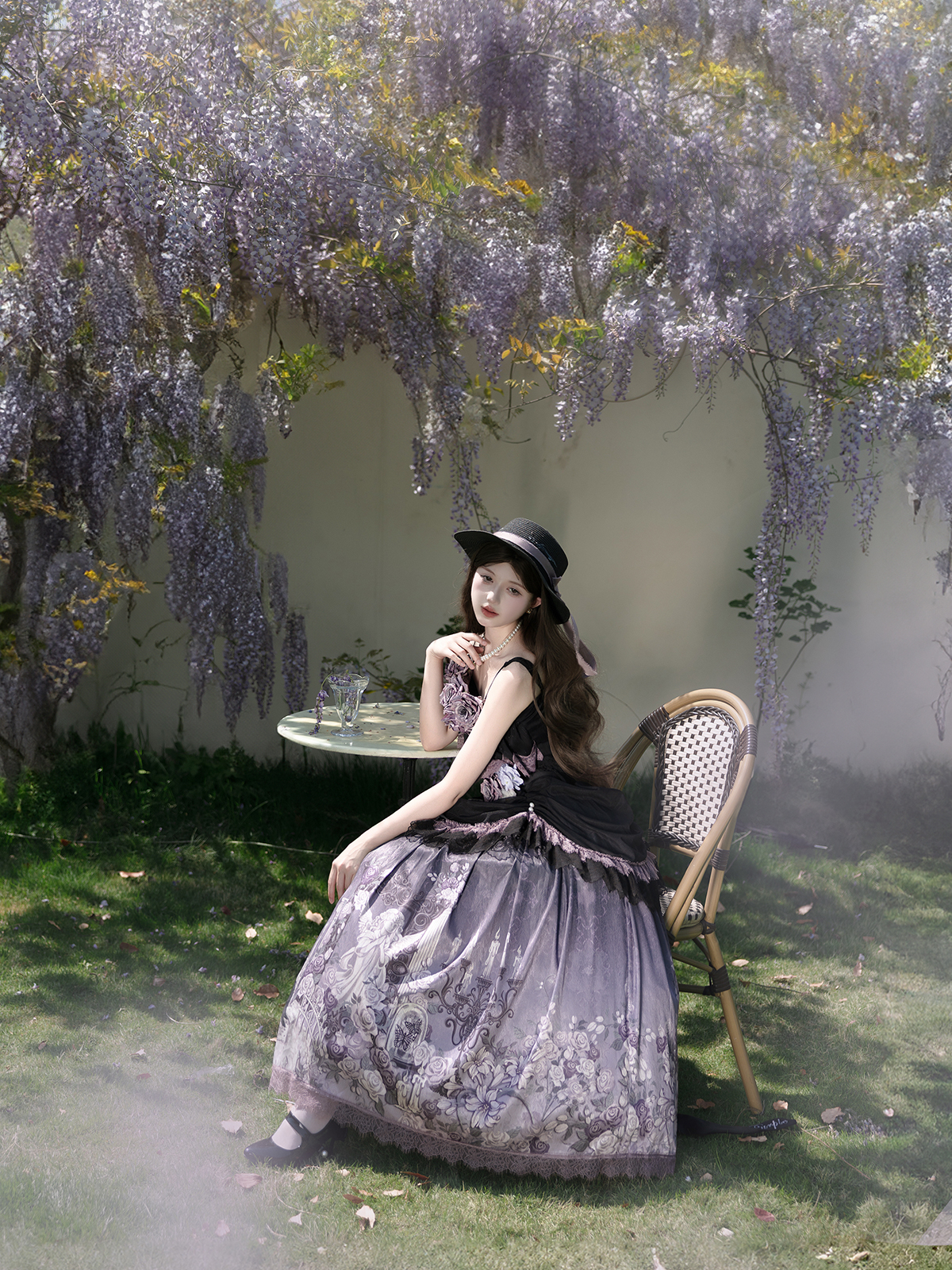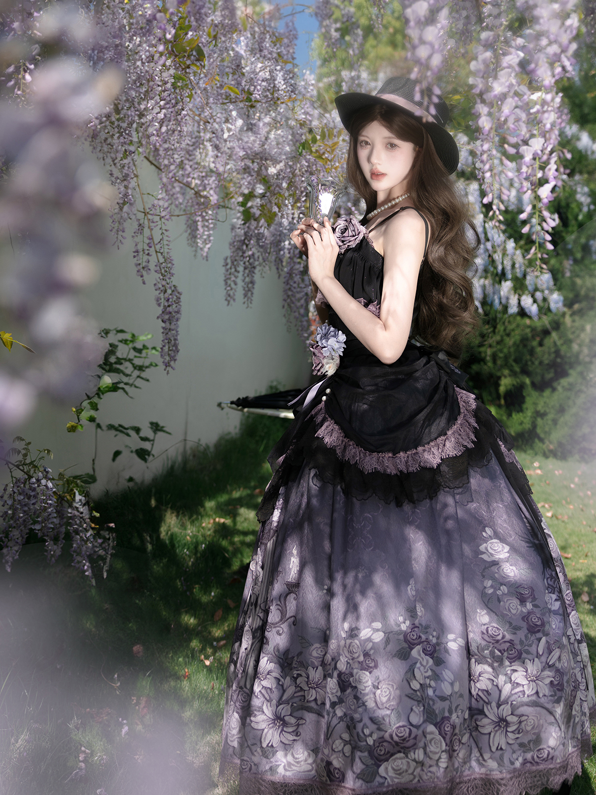 Designed with a dark, elegant aesthetic, this Gothic Lolita set blends deep black and lavender-grey tones. The off-shoulder camisole bodice is accented with a detachable rose and thematic streamers, while the voluminous skirt features an outer layer of black gauze lace printed with atmospheric motifs of roses, ravens, and European architecture. A versatile two-piece design suitable for anime conventions and gothic tea parties.