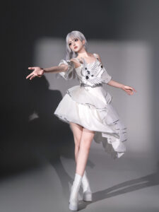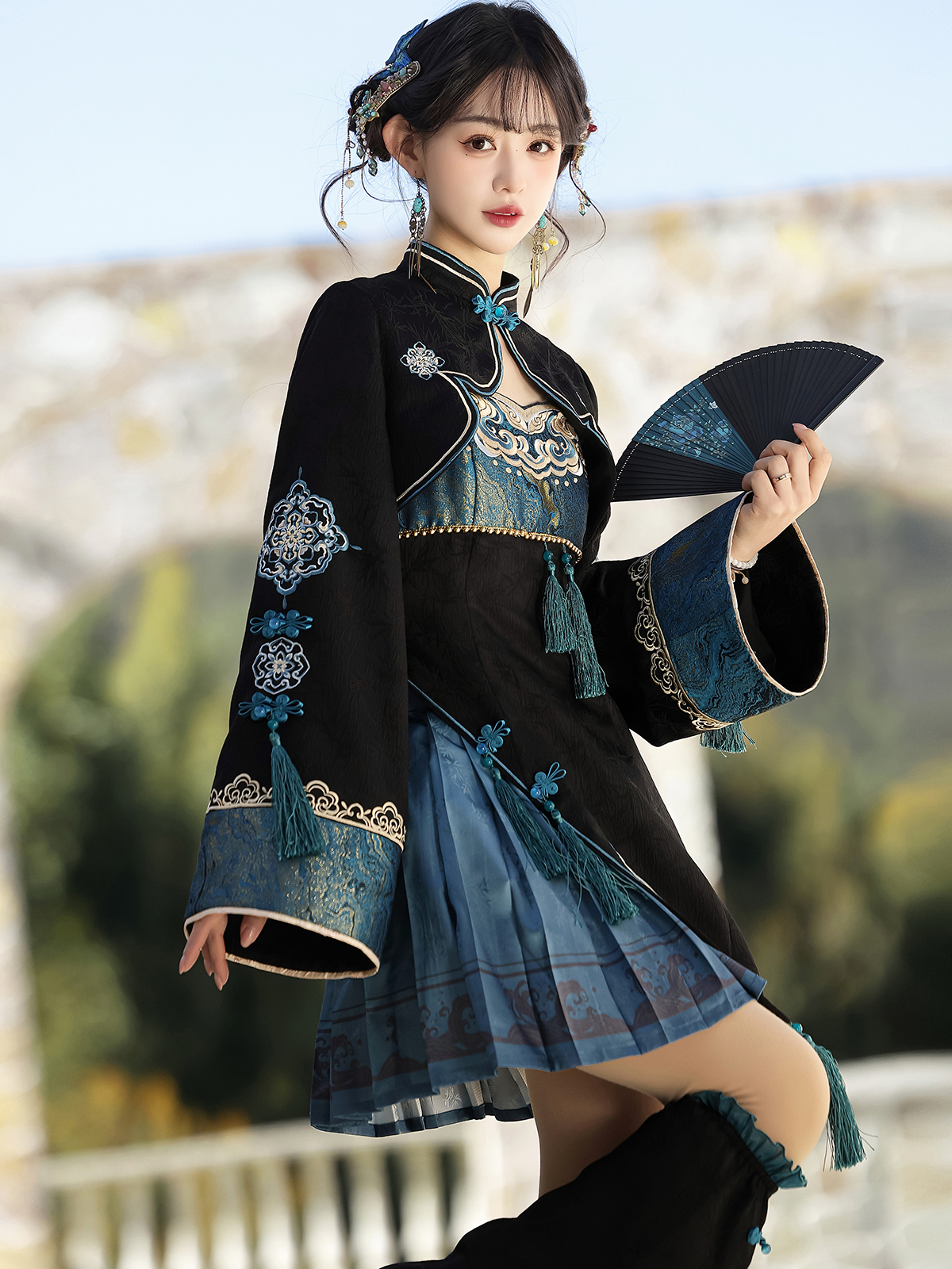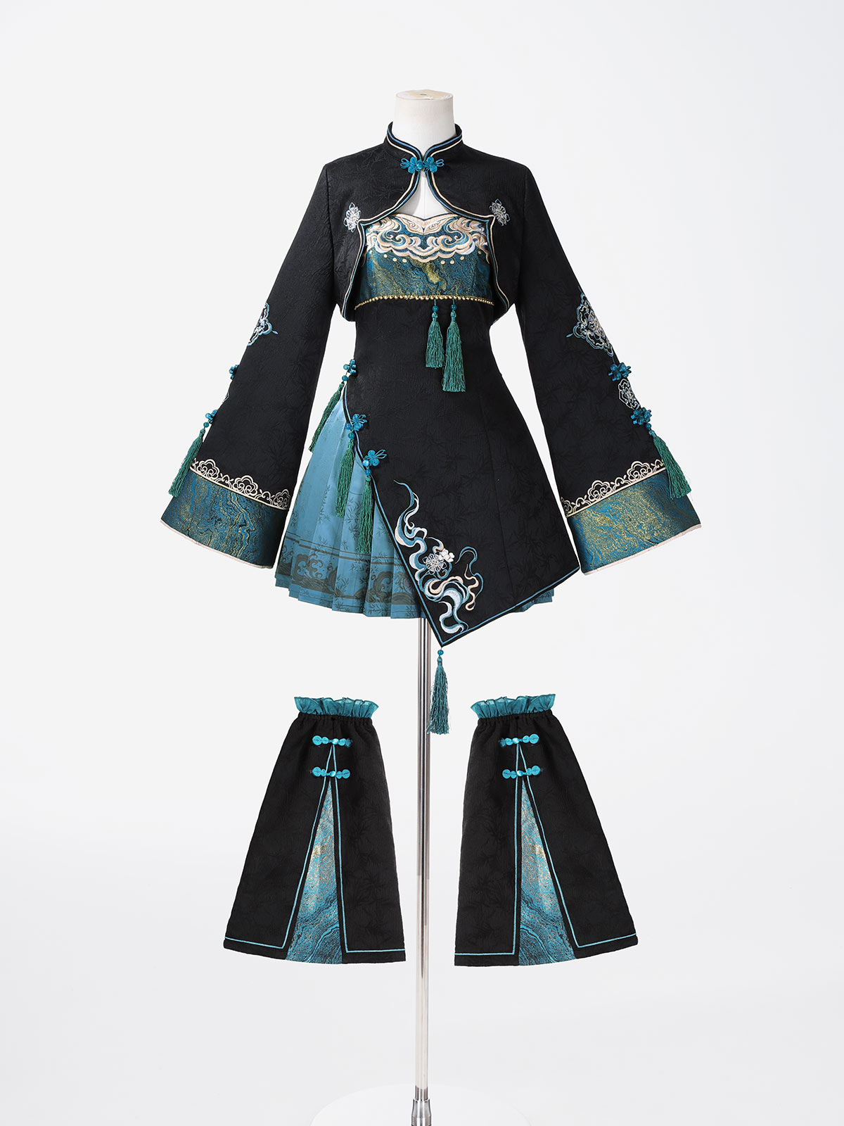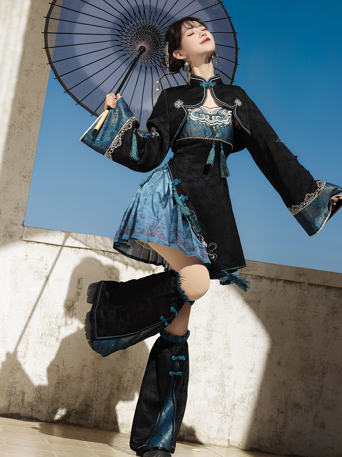 Ethereal Oriental aesthetics define this dreamy set, featuring gradient fabric that mimics rising blue smoke. Intricate embroidery on the camisole dress and matching leg covers blends modern Chinese elements with Lolita charm, perfect for summer photoshoots.