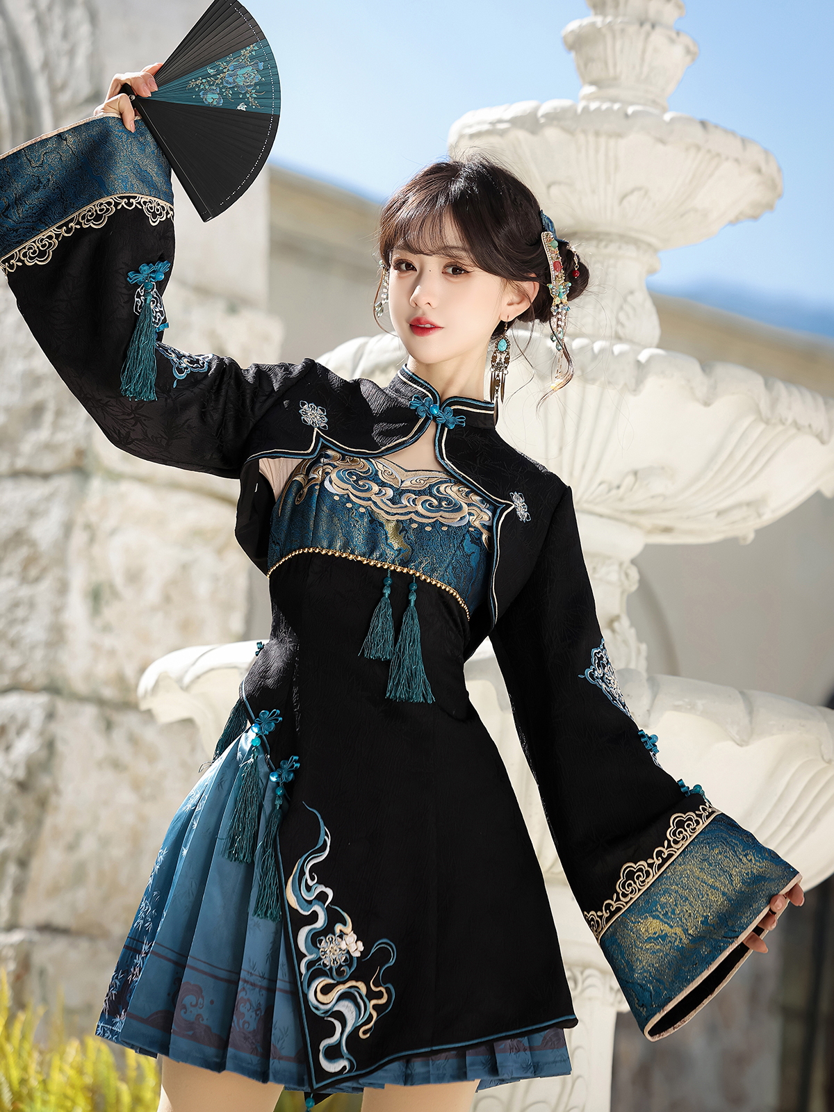 【Blue Mist】 Uncharted Stars Original Hanfu Women’s Chinese Style Hanfu Element New Chinese Style Dress Set Spring/Summer – Frog Buttons, Tassels, Embroidery