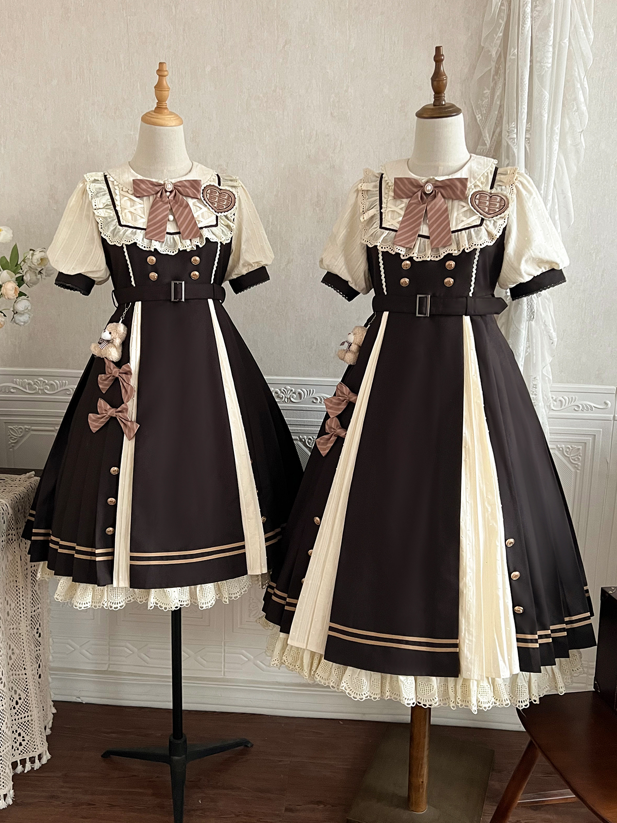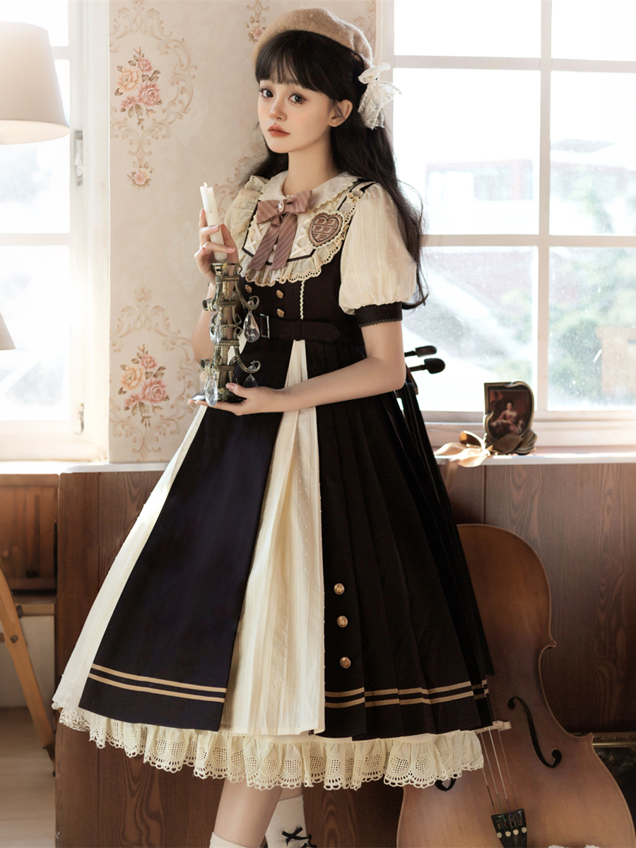 Capturing a sweet academic aesthetic, this Lolita dress features a gentle deep brown and cream-white palette. The design includes a Peter Pan collar with lace patchwork, a striped bow, and a heart-shaped brooch. With its puff sleeves, double-breasted gold buttons, and bear charm accents, it offers a rich, layered look perfect for campus wear and daily outings.