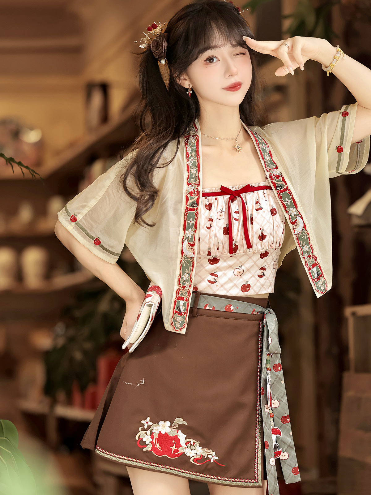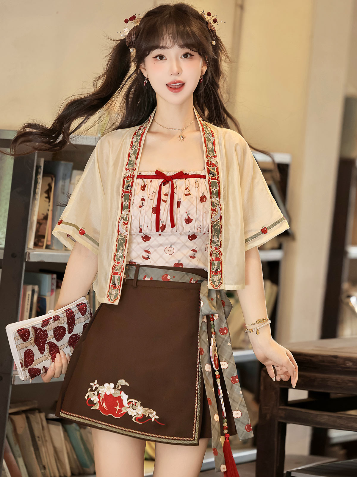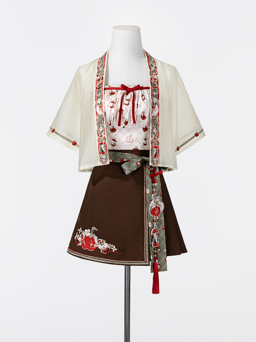 Refreshing summer sweetness defines this vibrant Lolita set, featuring a playful apple print on a tiered skirt. The light camisole top and energetic charm make it an ideal choice for picnics and casual outdoor gatherings.