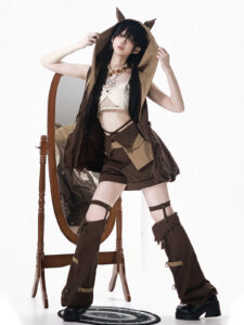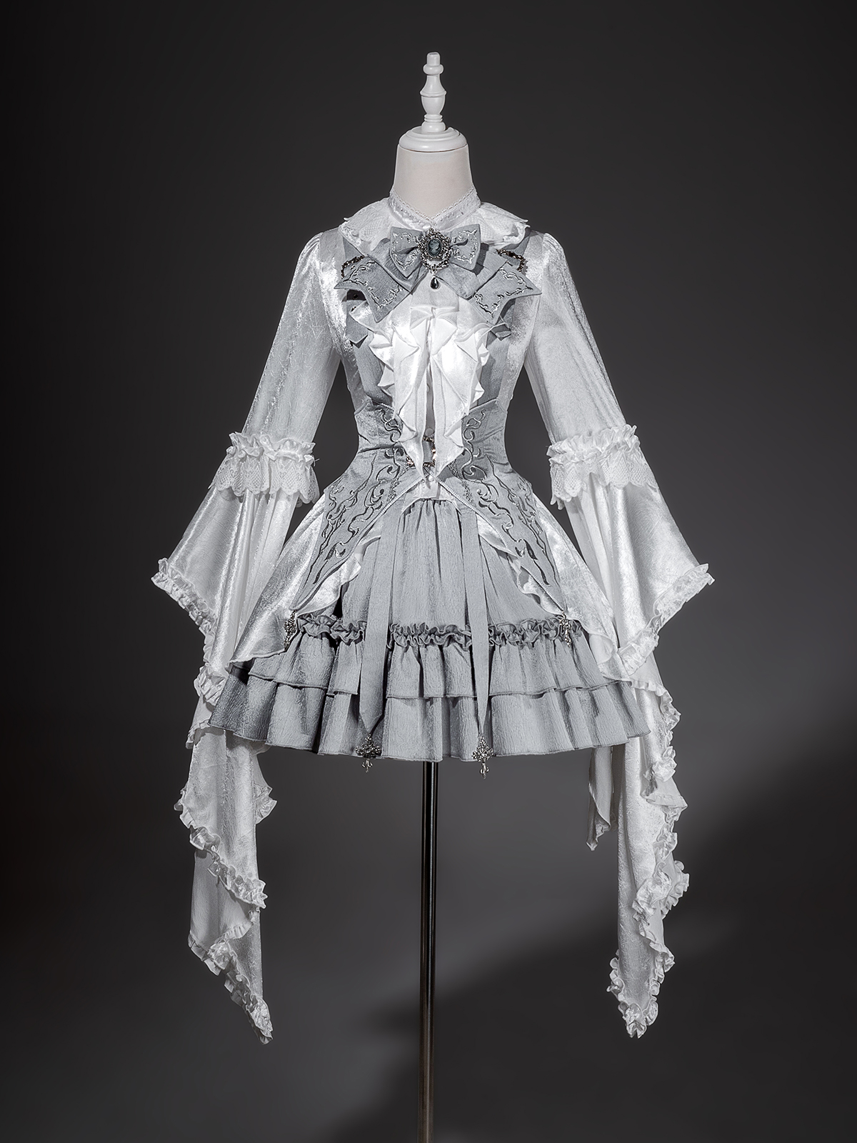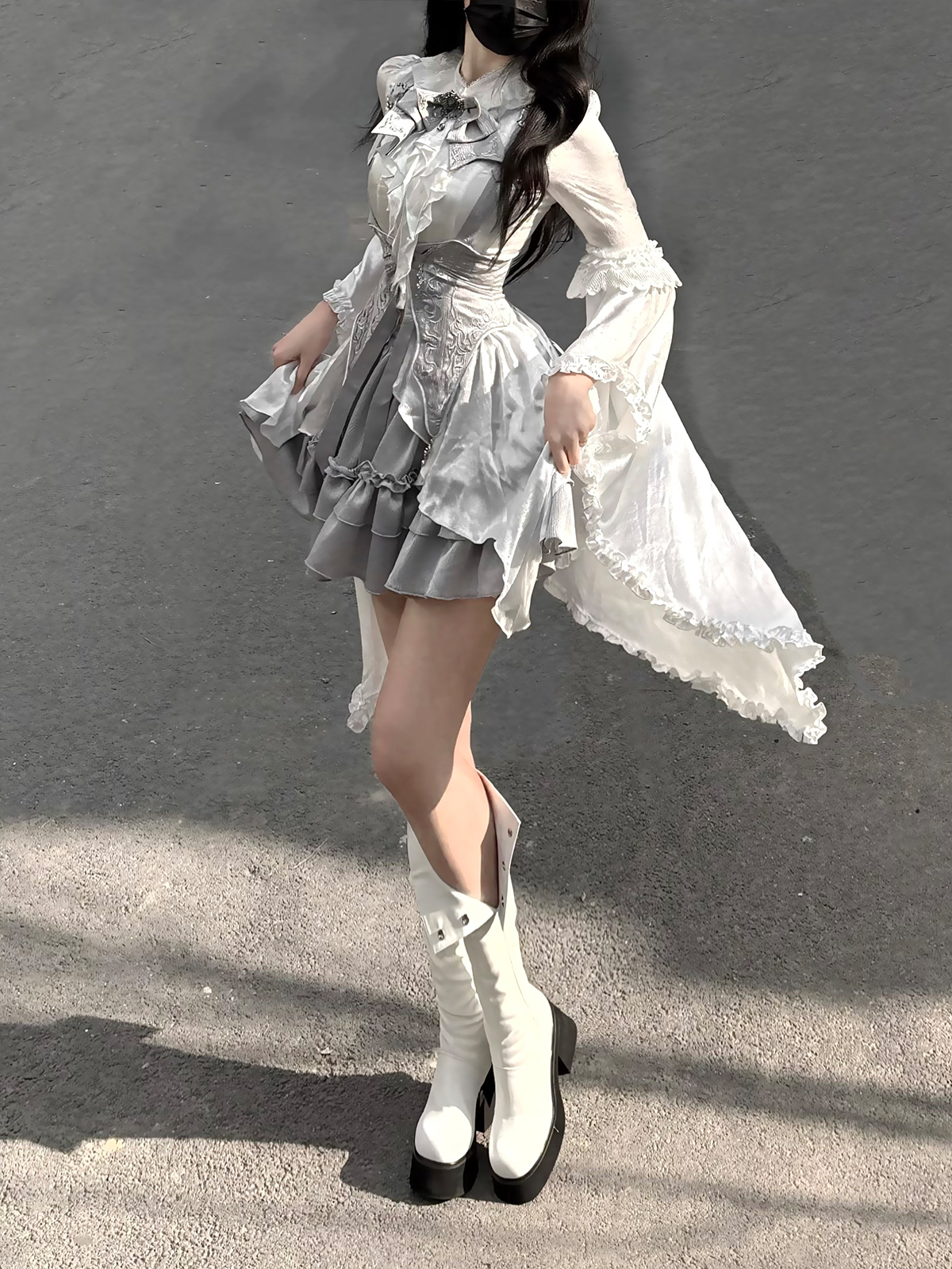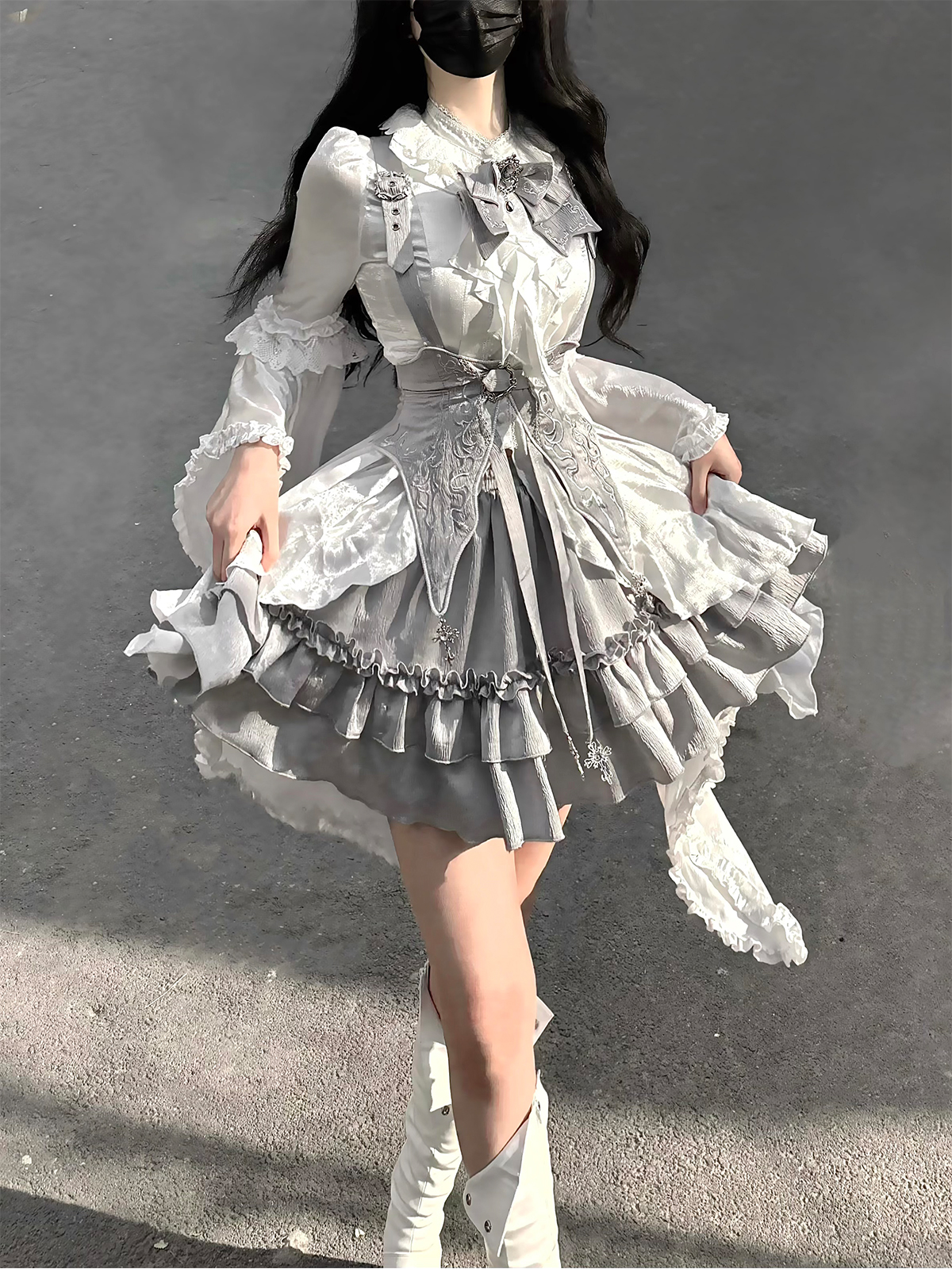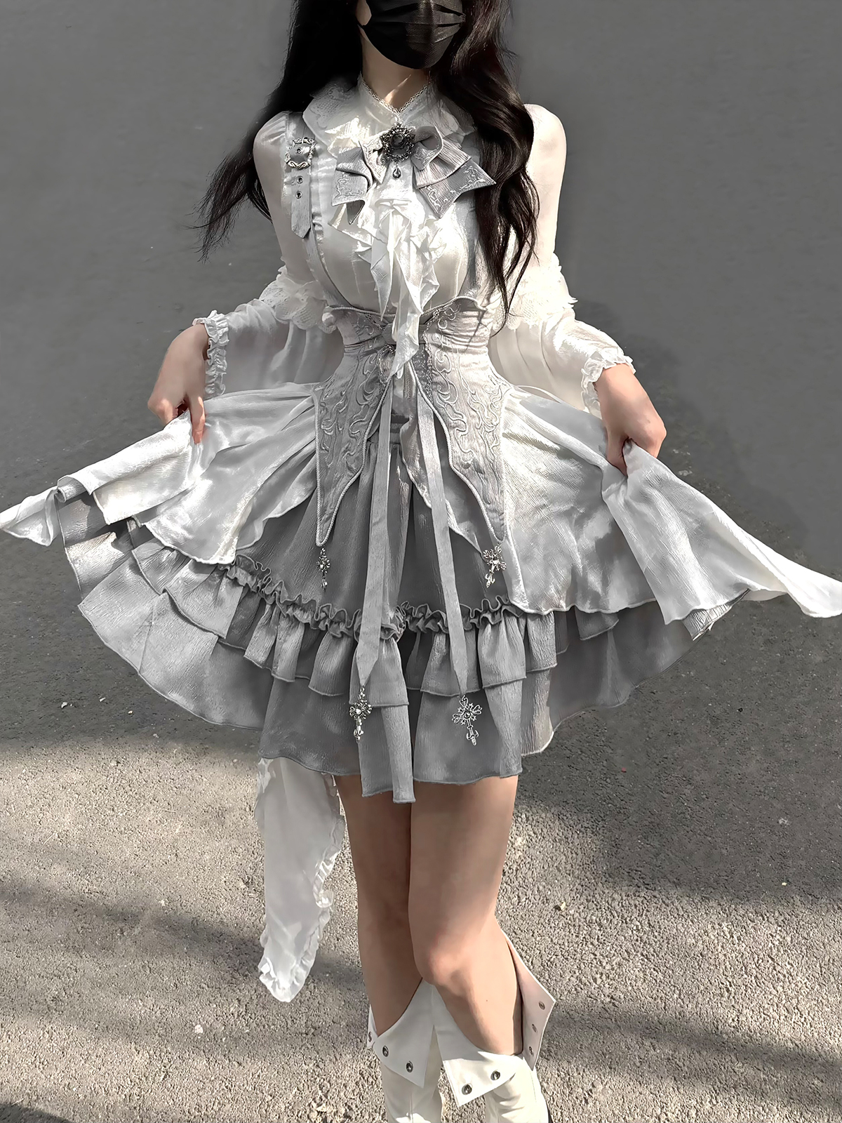 This design features a multi-layer layered construction, consisting of a stand-collar lace blouse, an embroidered waist-cinching vest, and an asymmetrical suspender skirt — three parts that create a rich, three-dimensional silhouette. It perfectly blends the dreaminess of European fairy tales, the refined mechanical aesthetics of steampunk, and the girlish charm of Lolita fashion, falling under the category of “fantasy / dress cosplay.” The overall palette of white, grey, and silver creates a cool, magnificent, fairy-tale aristocratic aura. It possesses both the ethereal flow of fairy tales and a sweet-cool, edgy style through metal accents and clean lines. This is a highly authentic look for anime conventions, themed photoshoots, and fantasy styling.